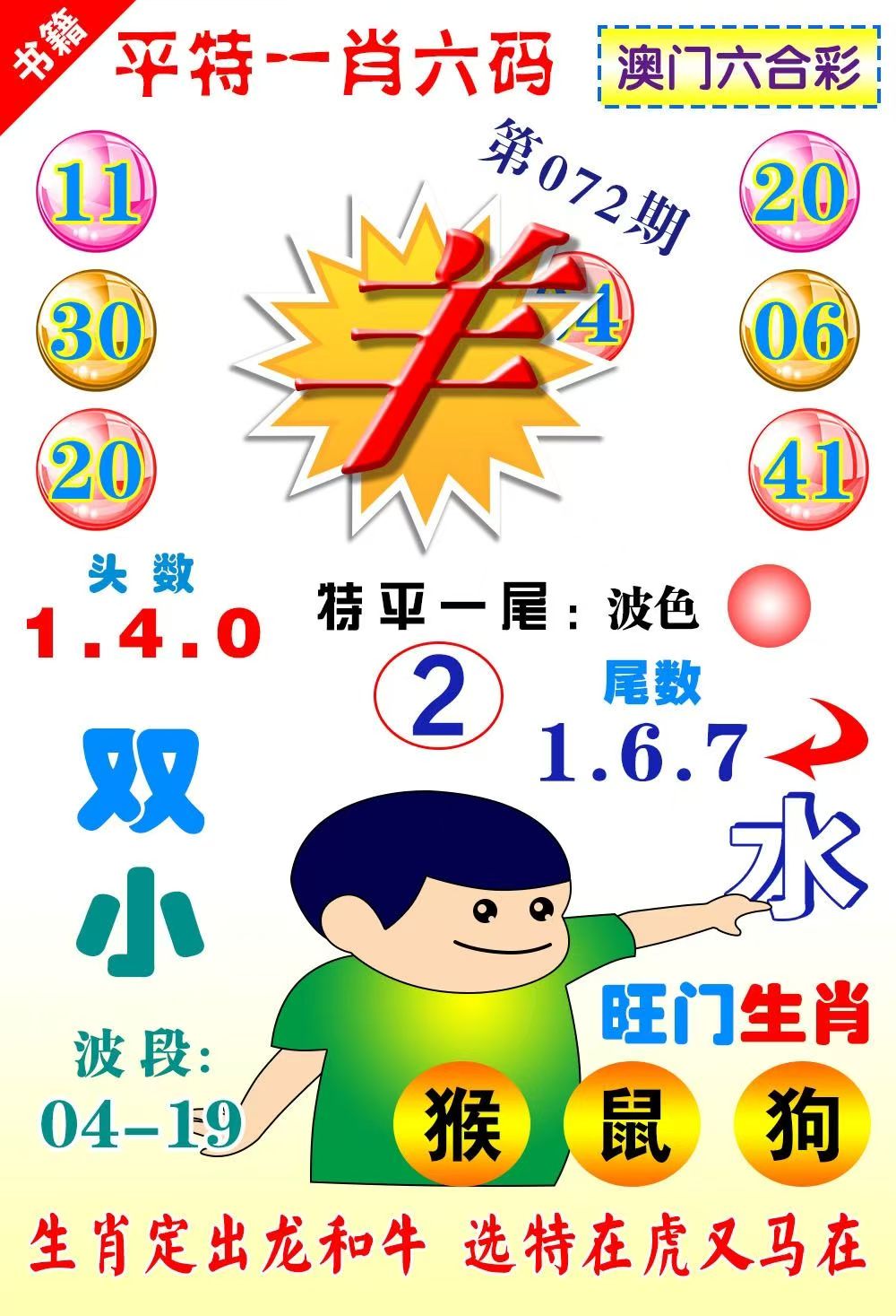 | 072期:七肖 | 猴虎猪兔蛇鸡牛 | 开:准00 |